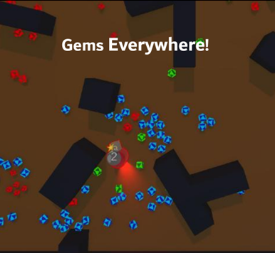 The main collectible in Quarry Kickin' are gems. These can be picked up and deposited at repositories to increase your team's score. I researched into ways to expand this mechanic or evolve it post-proof of concept, and this led to the idea of large gems.