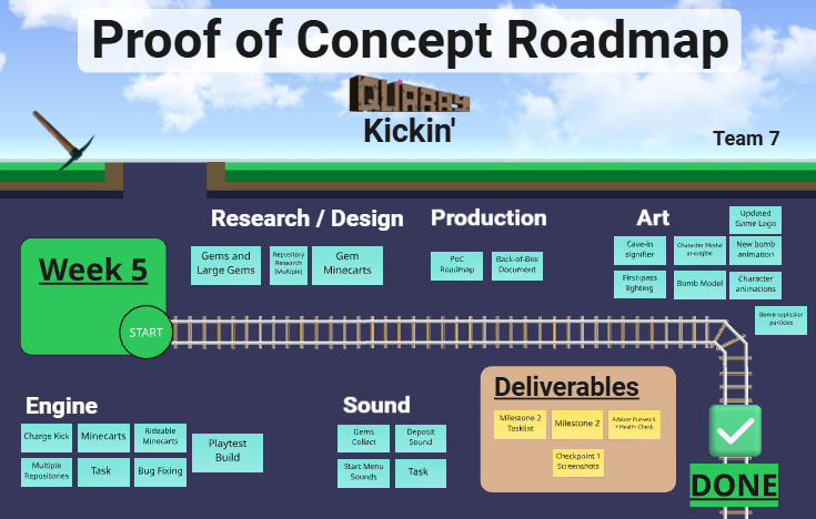 This was created as a response to me realizing our current task-tracking methods weren't as resonant or accessible to the team, so I created this much more visually appealing version and also printed them out, placing them around our workspace so members could always glance over and see what was going on. It's not only helped us understand where we are, but is easy to iterate and accessible to the team, and making it themed like a mine helped sell us on our game world we're creating.